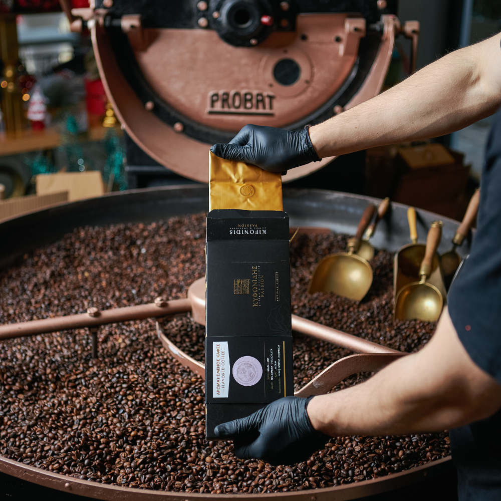 Φρεσκοψημένοι κόκκοι καφέ Blend, αρωματισμένοι με αιθέρια έλαια ή αρώματα, σε αεροστεγή συσκευασία 250 γρ. Οι κόκκοι του καφέ αρωματίζονται αμέσως μετά το καβούρδισμά τους με μία ιδιαίτερη τεχνική που εξασφαλίζει τη μέγιστη δυνατή διείσδυση του αιθέριου ελαίου ή του αρώματος στους κόκκους του καφέ και τον εγκλωβισμό του εκεί μέχρι τη στιγμή της άλεσης όπου απελευθερώνονται όλα τα αρώματα καταλήγοντας στο φλιτζάνι σας.