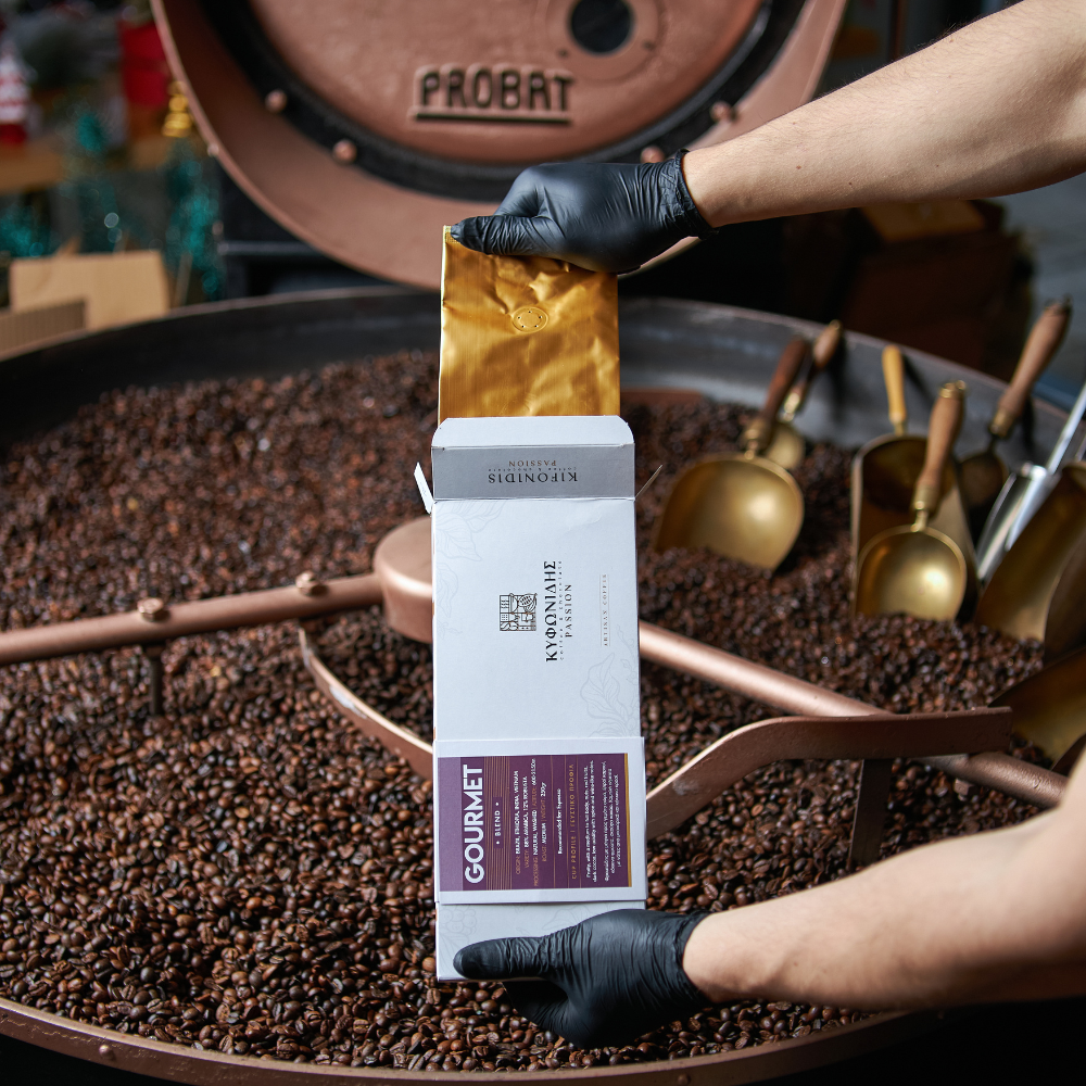 Φρεσκοψημένοι κόκκοι καφέ από επτά ποικιλίες, σε αεροστεγή συσκευασία 250 γρ.